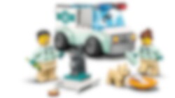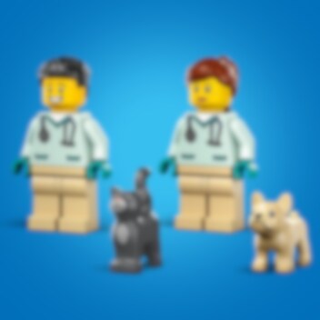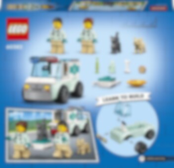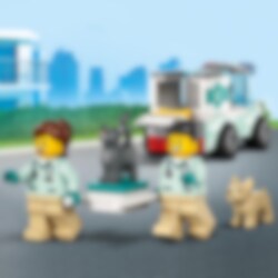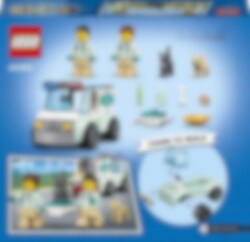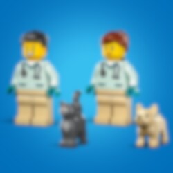 Ga samen met de dierenartsen op reddingsmissies. Laad je uitrusting in de coole reddingswagen en ga op pad. Help de hongerige kat te voeren met de drinkfles. Trakteer de hond op een lekker bot. Gebruik de brancard om zieke dieren op te tillen en de injectiespuit om medicijnen toe te dienen. Beleef zelf hoe het is om dieren te verzorgen met deze LEGO® City set!