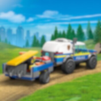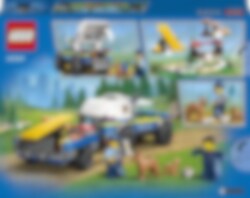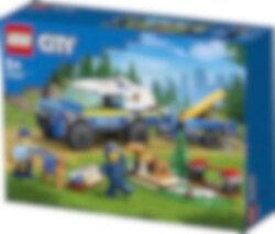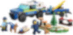 Woef woef! Ga mee met de hondenbrigade van de LEGO® City Politie voor het trainen van een hond en een puppy. Laad de uitrusting in de aanhanger. Vergeet de voerbakken niet! Help de enthousiaste politiehond en pup in de coole terreinwagen en rijd naar het trainingsveld. Zet bij aankomst de wipwap, de hindernis en de stappootjes klaar en geniet van een leuke dag.