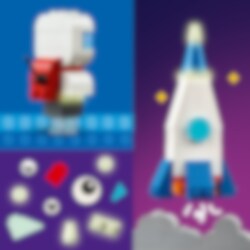 Schiet de ruimte in met 5 eenvoudig te bouwen modellen: een lachend zonnestelsel, een ruimteraket, een grappig buitenaards wezen, een geweldige astronaut en Saturnus met zijn beroemde ringen. Geef je modellen een boost met felle kleuren en glow-in-the-dark stenen. Probeer daarna, voordat je terugkeert naar de aarde, 10 nieuwe ideeën voor de meest buitenaardse creaties in het universum!