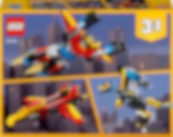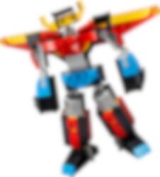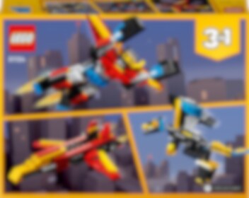Reis naar de toekomst voor geweldige avonturen met deze spectaculaire Superrobot! Hij kan steden beschermen met zijn ongelofelijke kracht of met zijn vleugels de lucht in gaan. Later kan de robot worden omgebouwd tot een verstelbare draak of een snel straalvliegtuig met verstelbare vleugels voor nog meer futuristische actie – of gebruik dezelfde stenen om iets volslagen nieuws te creëren! Met deze geweldige 3in1 set kun jij beslissen.