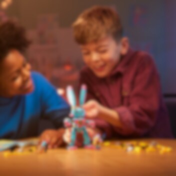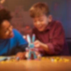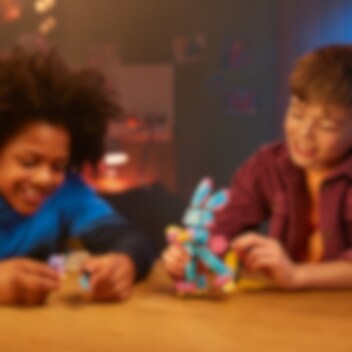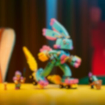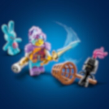 Laat kinderen van 7 jaar en ouder zich in de actie van de Dromenwereld storten met deze LEGO® DREAMZzz Izzie en Bunchu het konijn (71453) bouw- en speelset. De set is gebaseerd op een spannende verhaallijn uit de tv-serie en laat kinderen Izzie helpen een grote versie van haar favoriete knuffeldier te maken om hem te redden na een ontvoering door een angstaanjagend Grimgebroed. 1 set, 2 manieren om te bouwen De grote, levende versie van Bunchu heeft een volledig verstelbare nek, armen en benen. Tijdens het bouwen kunnen kinderen hun fantasie gebruiken en de bouwinstructies op basis van verhalen volgen. Ze kunnen Bunchu rolschaatsen en handschoenen of bijenvleugels en een angel geven. Fantastische minifiguur Inclusief een gedetailleerde minifiguur van Izzie met accessoires zoals een harnas, een zwaard en een zandloper. Figuren van het Grimgebroed en een kleine Bunchu zijn ook inbegrepen, zodat kinderen het hele verhaal kunnen naspelen.