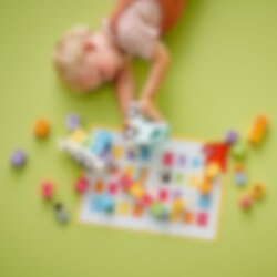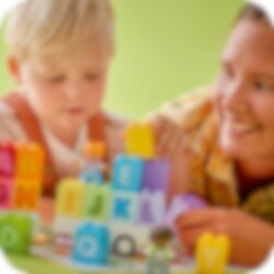 Laat peuters kennismaken met letters met de LEGO® DUPLO® Stad Alfabetvrachtwagen (10421) om te bouwen en mee te spelen. Dit creatieve ABC-speelgoed biedt volop leerplezier. Wanneer peuters de aanhanger aan de speelgoedvrachtwagen koppelen en de 2 LEGO DUPLO figuren helpen met het in- en uitladen van de stenen beginnen ze letters te herkennen, leren ze over kleuren, verbeteren ze hun taalvaardigheid en versterken ze hun fijne motoriek. Fantasierijke accessoires zijn onder andere een LEGO DUPLO boekelement en een stereo-element om leuke ABC-meezingers met ouders en peuters aan te moedigen. Dit educatieve speelgoed stimuleert peuters om creatieve verhalen te verzinnen terwijl ze in de cabine van hun speelgoedvrachtwagen klimmen en op weg gaan naar een nieuw avontuur! Geef peuters een geweldige start met LEGO DUPLO bouwspeelgoed, waarmee ze onbeperkt kunnen spelen, leren en zichzelf kunnen uiten.