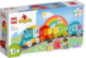 Dit is de kleurrijke nieuwe versie van de immens populaire LEGO® DUPLO® Getallentrein! Peuters kunnen de genummerde stenen in- en uitladen, in de juiste volgorde plaatsen en stapelen als een getallenmuur. Met de poster/speelmat wordt het bouwen nog leuker. Met zijn bewegende wielen, dak dat open kan en vriendelijke figuren neemt de Getallentrein jouw peuter mee naar een fantasierijke wereld vol leerzaam speelplezier!