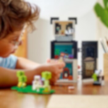 Als je van Minecraft® panda's houdt, zul je dit pandahuis met 3 verdiepingen geweldig vinden! Open de achterkant om de verschillende kamers te bekijken, elk gevuld met coole accessoires voor creatief plezier. Zin in iets nieuws? Herbouw je pandahuis zodat de panda zit of op alle 4 de poten staat! Ga samen met een onderzoeker de bamboejungle in. Voer taart aan een panda en babypanda – maar kijk uit voor het skelet met de kruisboog!