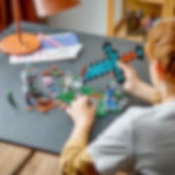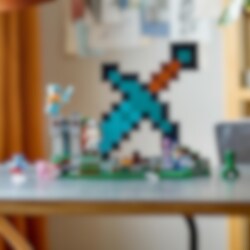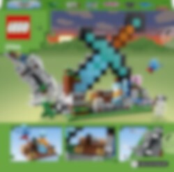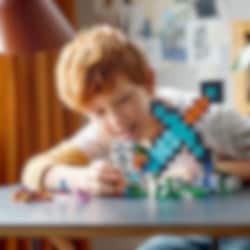 Geef een Minecraft® speler van 8 jaar of ouder een gigantisch diamanten zwaard cadeau! De LEGO® Minecraft Uitvalbasis Zwaard (21244) gebruikt het kostbare wapen als ontwerp voor een supercoole basis waar kinderen kunnen relaxen en explosieve confrontaties kunnen aangaan. Model van een diamanten zwaard om mee te spelen en neer te zetten Kinderen bouwen een basis in de vorm van een enorm diamanten zwaard en verdedigen deze tegen vijandige mobs. Er is een tafel, koekje en jukebox waarop ze een plaat kunnen 'afspelen'. Buiten staan figuren van een schildwacht en strijder-bewaker op wacht. De 2 schieters aan de voorkant zorgen voor extra vuurkracht. Inclusief een Creeper en een skelet, plus een varken en een Allay met folievleugels. Een hendel onder aan de toren zorgt voor een explosie die een deel van het bouwwerk laat instorten. Voor extra digitaal plezier heeft de LEGO Builder app intuïtieve zoom- en draaifuncties waarmee kinderen hun model kunnen visualiseren terwijl ze het bouwen.