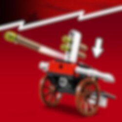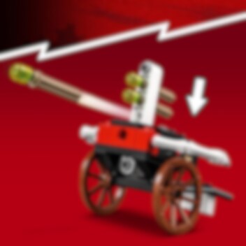 Bereid je voor op een geweldige confrontatie van Jay in zijn sterkste mecha en zijn medeninjastrijder Nya die het opnemen tegen 3 gevaarlijke groene bottenstrijders. Kijk uit! Bottenkoning, Bottenridder en Bottenjager willen hen uitschakelen met een dubbele kruisboog op een kar die is geladen met 4 snelvuurpijlen. Verdedig je met het grote drakenzwaard van de mecha, 2 katana's en 2 schieters. Je moet NINJAGO® City van de aanval redden!