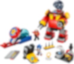 Kinderen vanaf 8 jaar werken samen met Sonic in deze LEGO® Sonic the Hedgehog Sonic vs. Dr. Eggmans eirobot (76993) speelset. Sonics aartsvijand Dr. Eggman en zijn handlanger Cubot hebben dieren gevangen om hun uitvindingen aan te drijven. Kinderen kunnen Sonics snelheidsbol lanceren om Dr. Eggman te verslaan voordat ze het laboratoriumgedeelte verkennen om informatie te verzamelen voor hun volgende missie. Snel actiespel Kinderen kunnen de snelheidsbol en de lanceerder gebruiken om over de helling en de stekels te vliegen. De eirobot heeft een afneembare capsule waarin Dr. Eggman de dieren plaatst. De dieren worden naar buiten geduwd en kunnen worden gered wanneer Sonic een voltreffer scoort op Dr. Eggman met behulp van de snelheidsbol. Meerdere manieren om te spelen De LEGO Sonic the Hedgehog speelgoedsets staan voor snelheid, actie en creatief spel. Fans van de Blauwe Waas kunnen de leukste Sonic avonturen naspelen en daarna doen alsof ze voor Sonics dierenvriendjes zorgen.