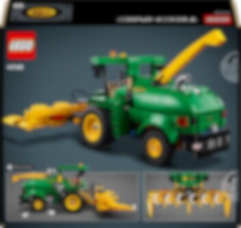 Voor een productieve oogst op grote schaal heb je een krachtige machine nodig. En er zijn weinig machines die krachtiger zijn dan de John Deere 9700 Forage Harvester. Bouw nu je eigen LEGO® Technic versie van dit machtige model, compleet met een voorzetstuk. Breng het omhoog, omlaag en draai het rond om de werking van een echte hakselaar na te bootsen.