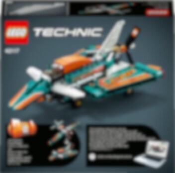 Scheer door de lucht in dit geweldige LEGO® Technic Racevliegtuig. Bewonder de opvallende kleuren en de sponsorstickers, net als op een echt racevliegtuig. Rijd rond op de grond terwijl je je voorbereidt om op te stijgen en kijk hoe de propeller ronddraait. Doe daarna de manoeuvres van de beste piloten ter wereld na. Ben je toe aan een andere leuke bouwuitdaging? Cool! Dan kun je jouw racevliegtuig ombouwen tot een straalvliegtuig.