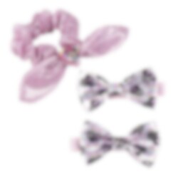 Maak elk kapsel extra feestelijk met deze glinsterende 3-delige set haaraccessoires met Minnie Mouse! De set bevat twee mooie haarspeldjes met regenboogkleurige strikjes en Minnie-afbeelding, en een roze glitter scrunchie met schattige konijnenoren.