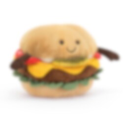 Een heerlijke kleine burger met een zonnige glimlach en goed gevuld met heerlijke inhoud. Het tweekleurige goudbruine burgerbroodje met kleine grappige armpjes in donkerbruin corduroy is gevuld met een luchtige ingelegde komkommer, een paar plakjes tomaat, zonnig gele kaas en een franje van faux suède groene sla, en de ster natuurlijk, een dikke, luchtige hamburger. Een ondersteunende en bemoedigende vriend of troostmaaltijd die zowel jong als oud zeker zal doen glimlachen. Handwas indien nodig.